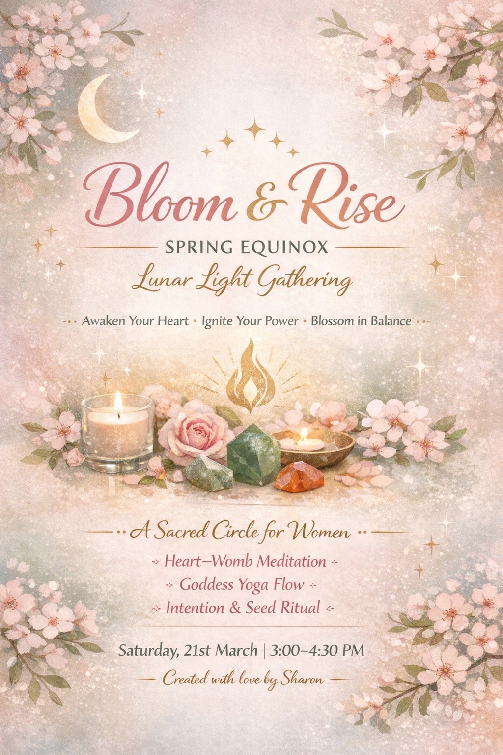 This Spring Equinox Lunar Light Gathering is a heart-centred evening of gentle movement, meditation and ritual, designed to awaken your inner bloom and ignite your sacred feminine fire.
